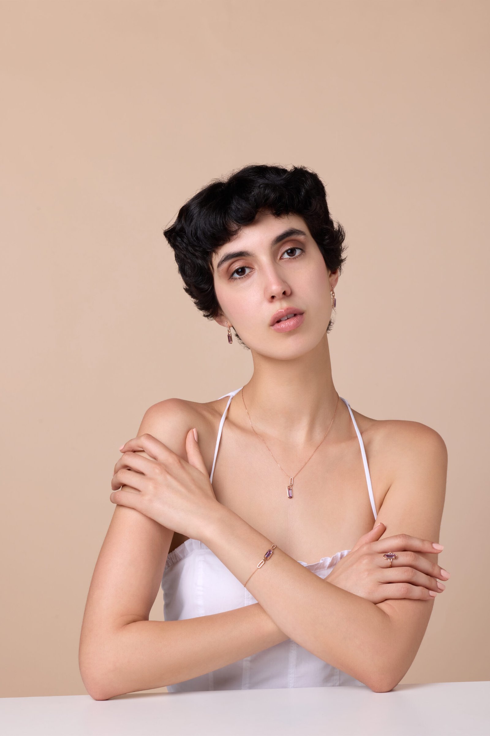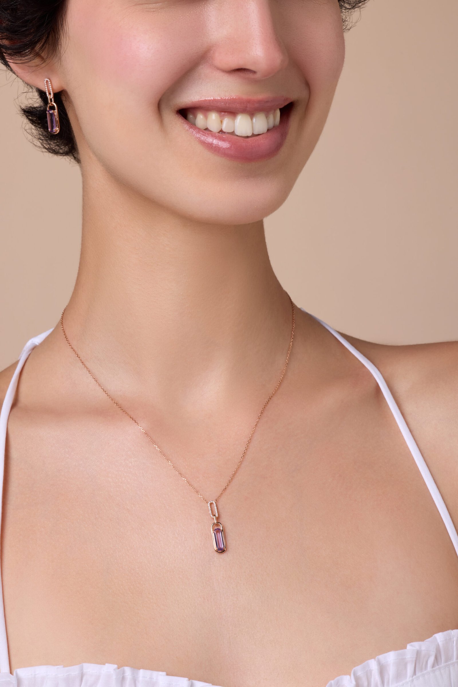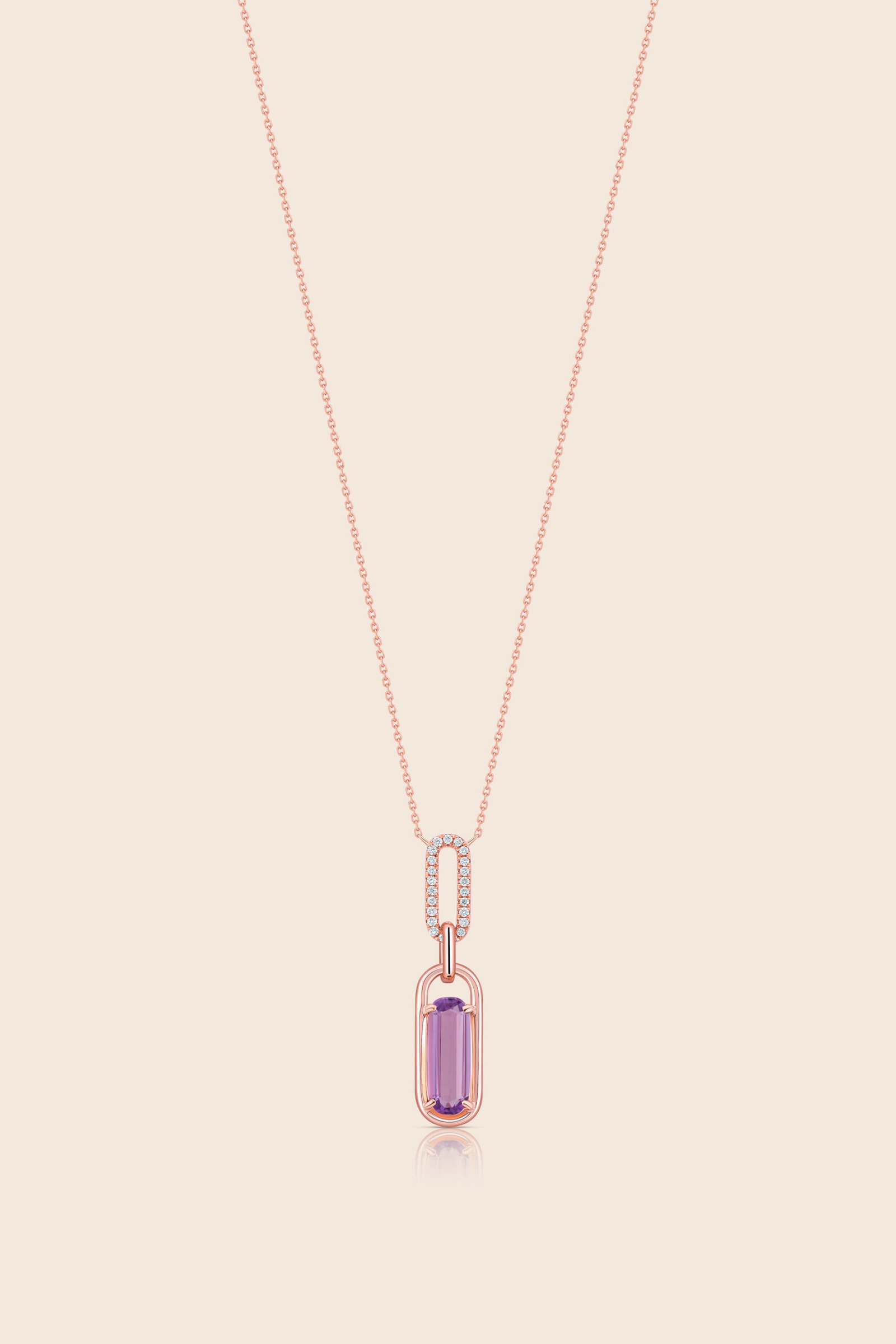 Amethyst glows beneath a halo of diamonds, set in rose gold, radiating tranquility, wisdom, and the understated beauty of soulful elegance.