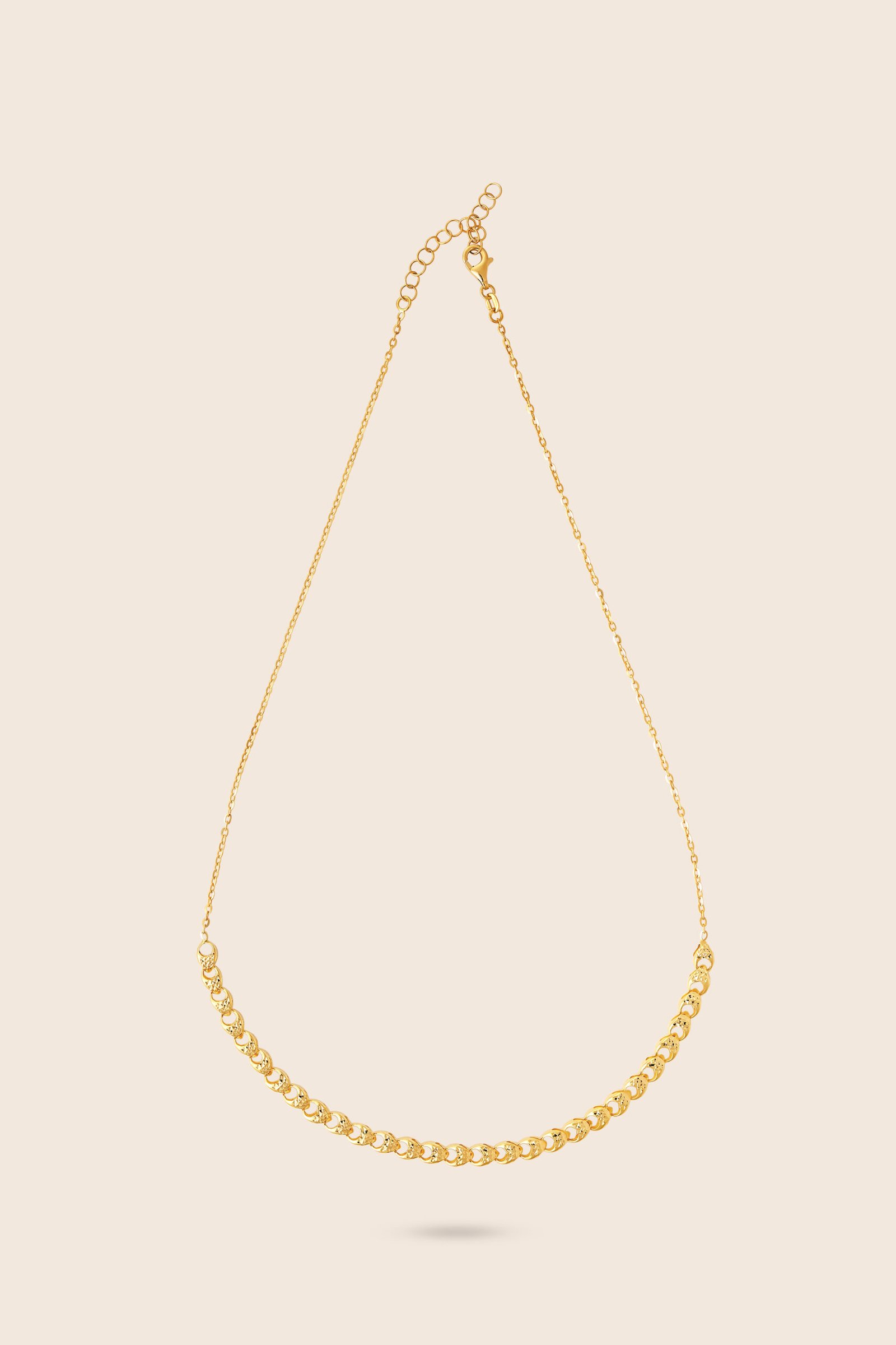 Crowned at the front with bold yellow gold links that fade into delicate golden strands, the necklace is defined by a blend of strength and elegance a subtle celebration of unity and timeless flow
