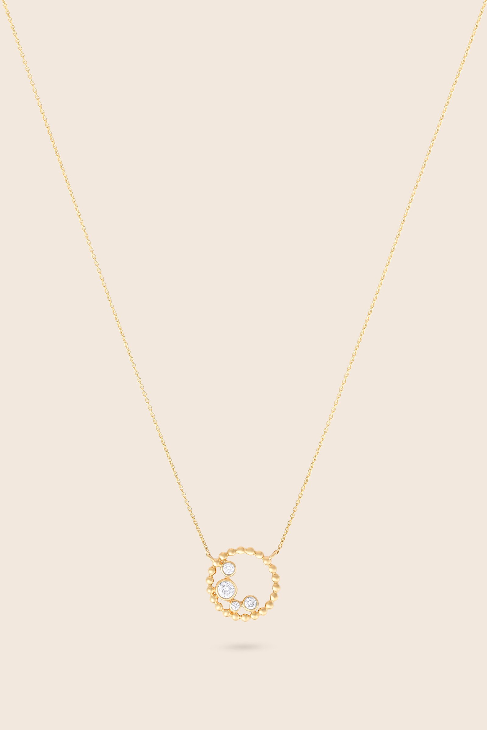A heart of playful bubbles, yellow gold orbs encircle diamonds that shimmer like captured laughter, eternalizing joy in every glimmer.