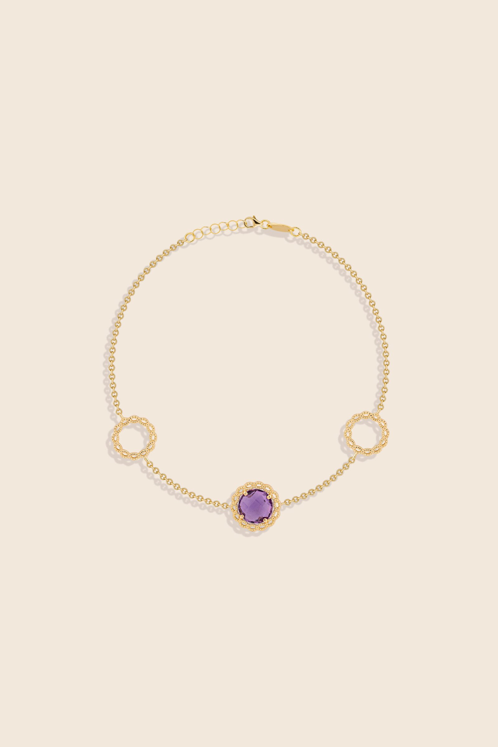 A single amethyst framed in gold, mirroring her soul pure, transparent, and gracefully resilient through every season of change