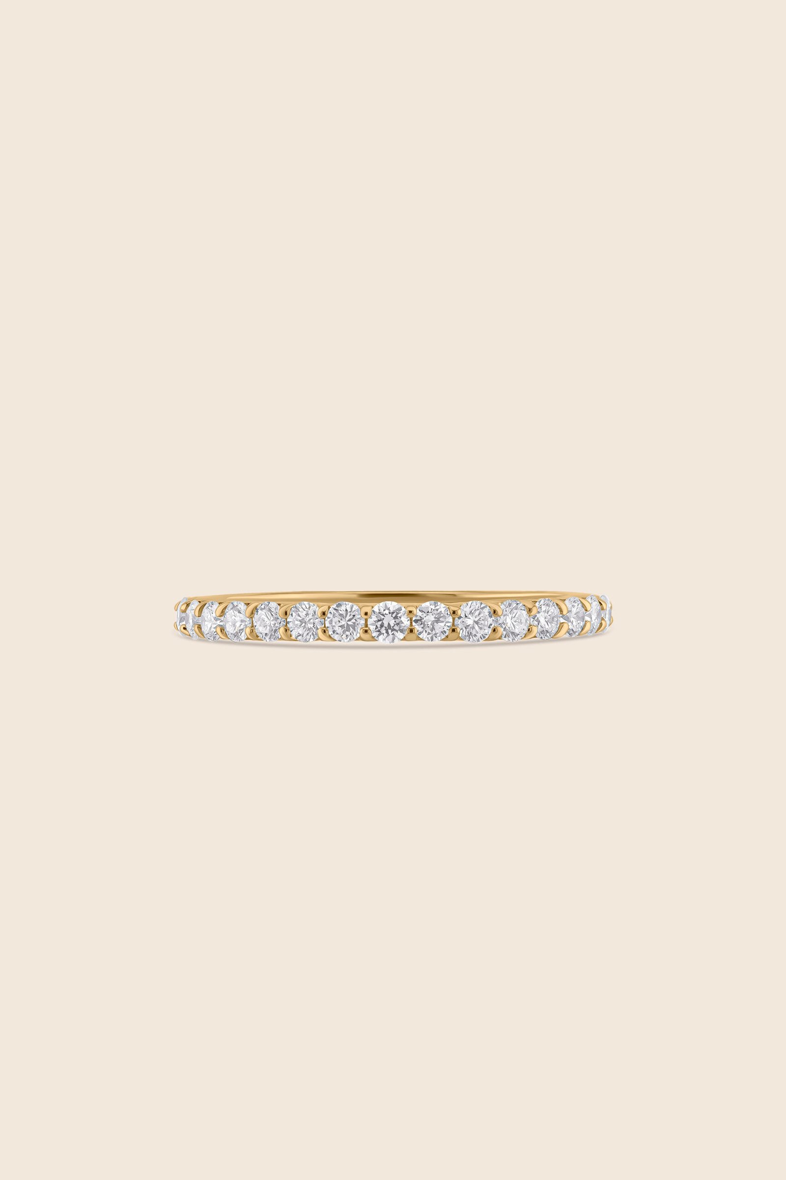 Yellow gold band set with diamonds in split prong basket setting classic radiance redefined in pure sophistication.