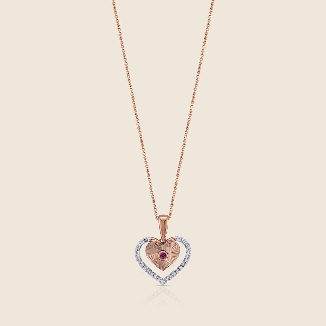 A rose gold heart cradles a ruby center, encircled by a halo of diamonds. A sparkling symbol of love?s eternal promise, it captures cherished memories and whispers devotion without a single word.