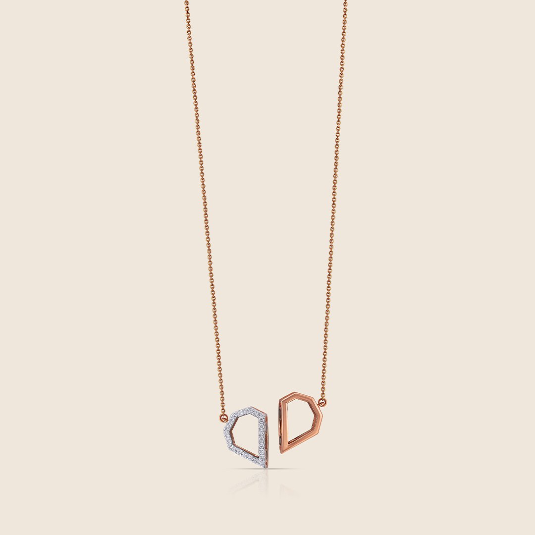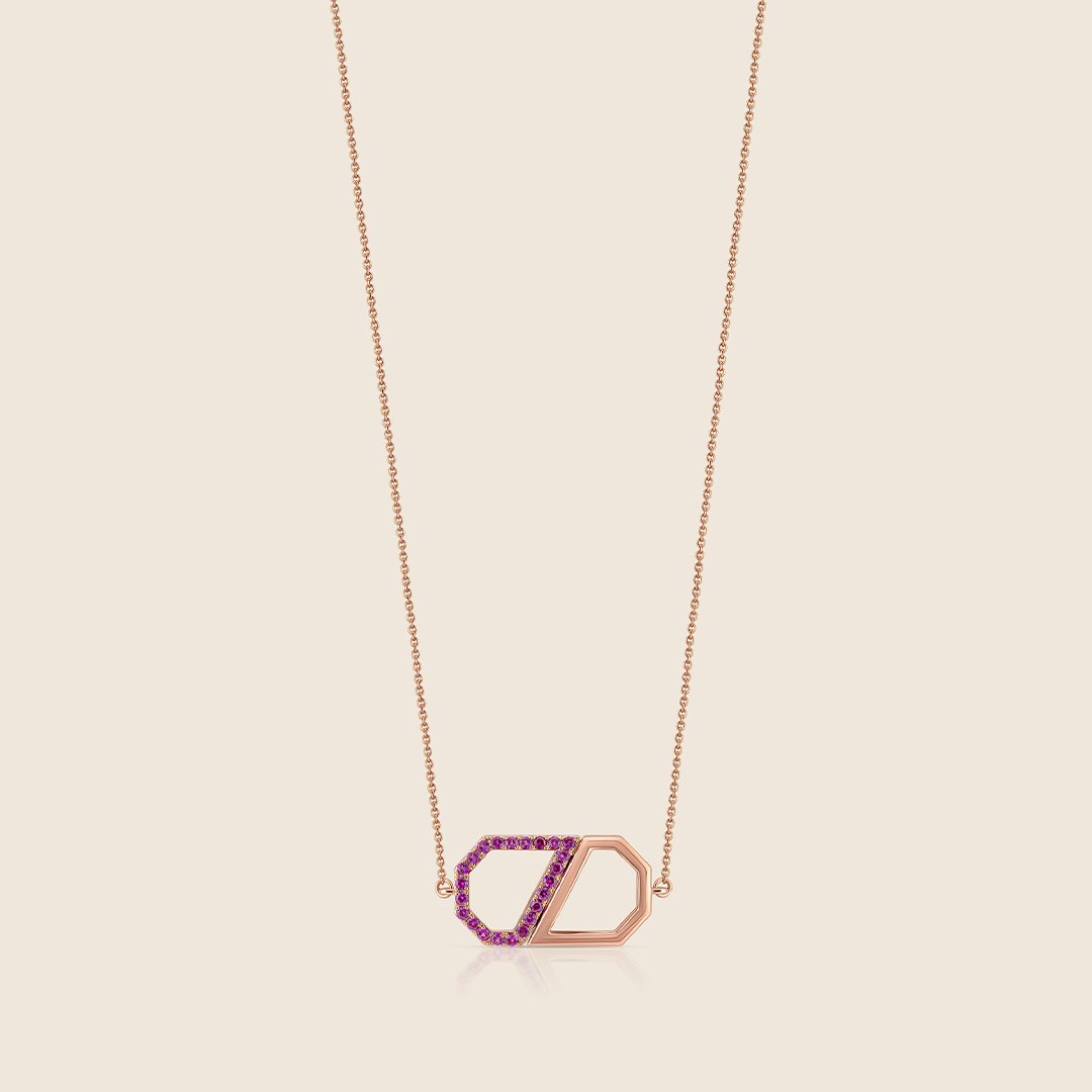 A rose gold necklace of two entwined pieces, one with ruby, the other forming a heart when turned. Versatile and radiant, it transforms with every flip, celebrating love, passion, and cherished memories.
