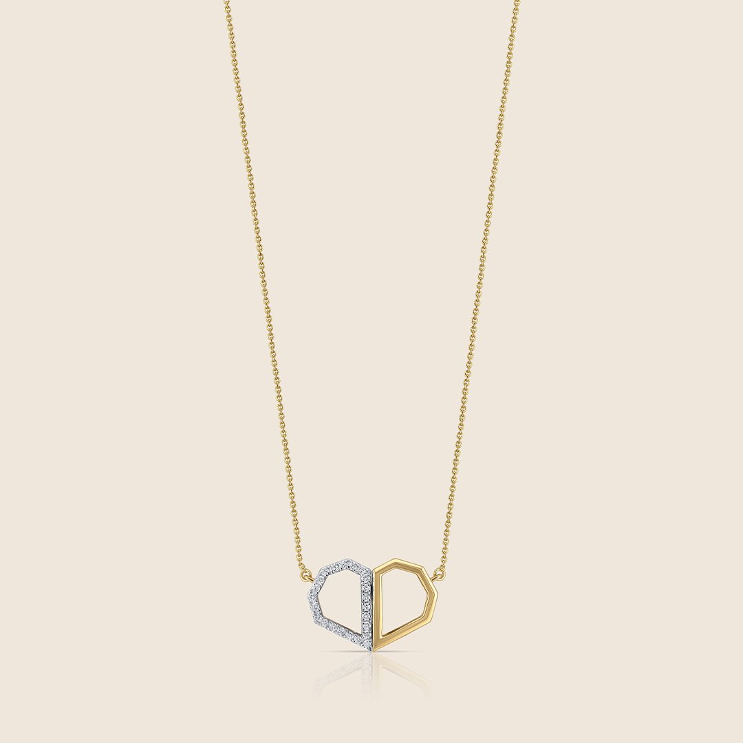 A yellow gold necklace of two entwined pieces, one with ruby, the other forming a heart when turned. Versatile and radiant, it transforms with every flip, celebrating love, passion, and cherished memories.