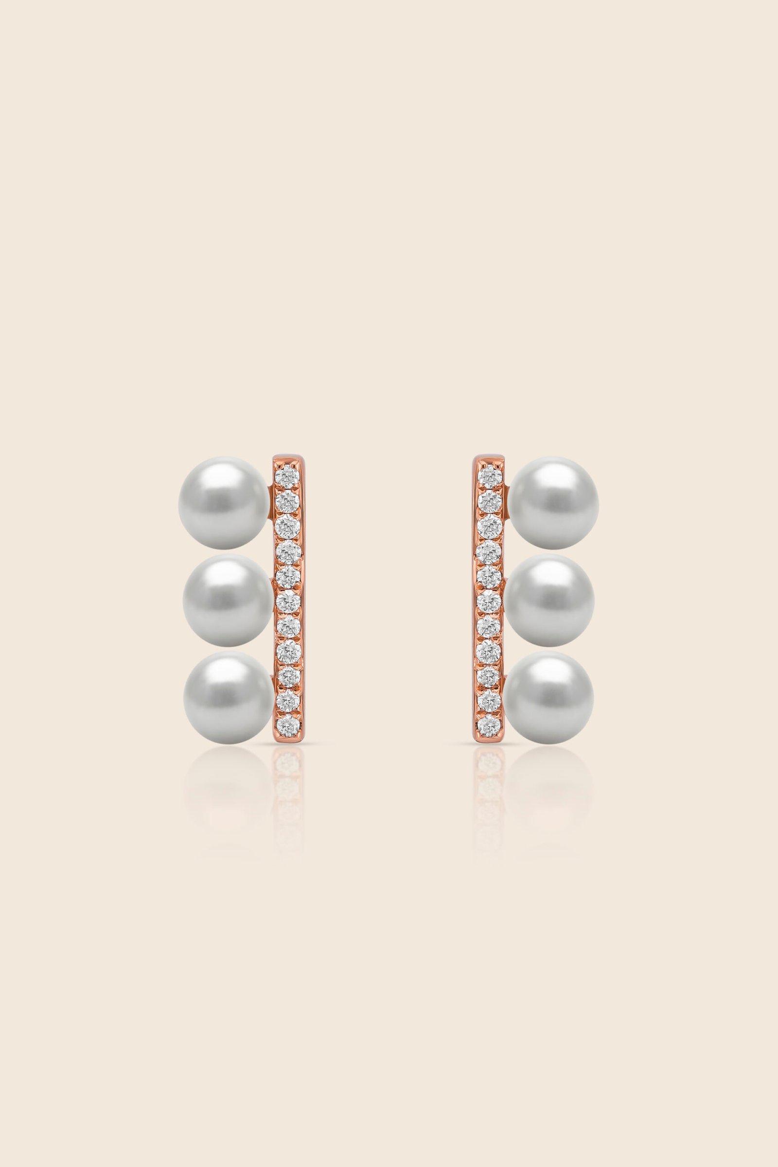 Shimmering with diamonds, a radiant line of rose gold gives way to five dangling pearls, forming an elegant cascade that mirrors the rhythm and grace of flowing waves