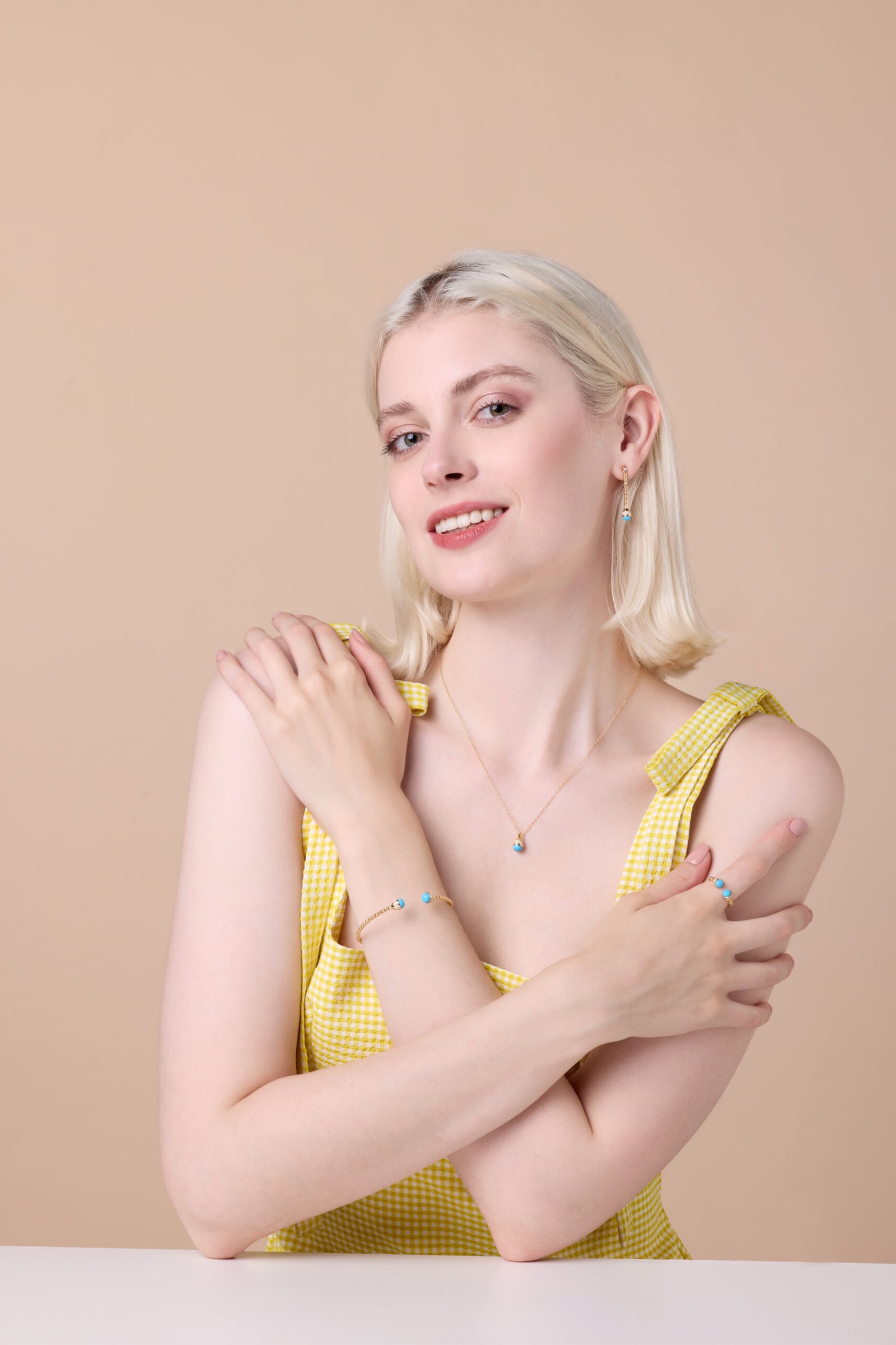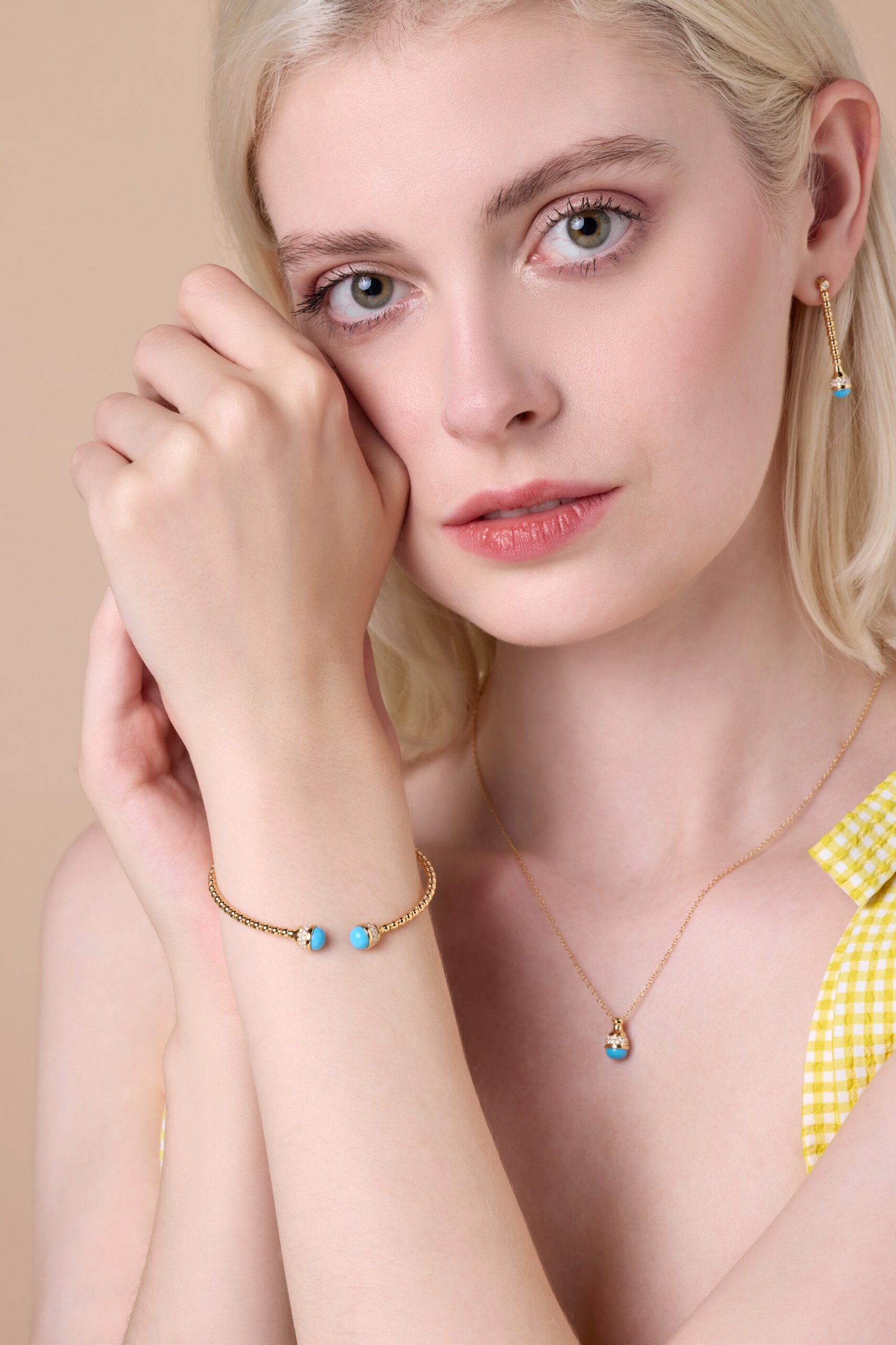 Turquoise drops dance along rose gold and diamond echoing playful elegance, soulful energy, and the radiant charm of bohemian sophistication.