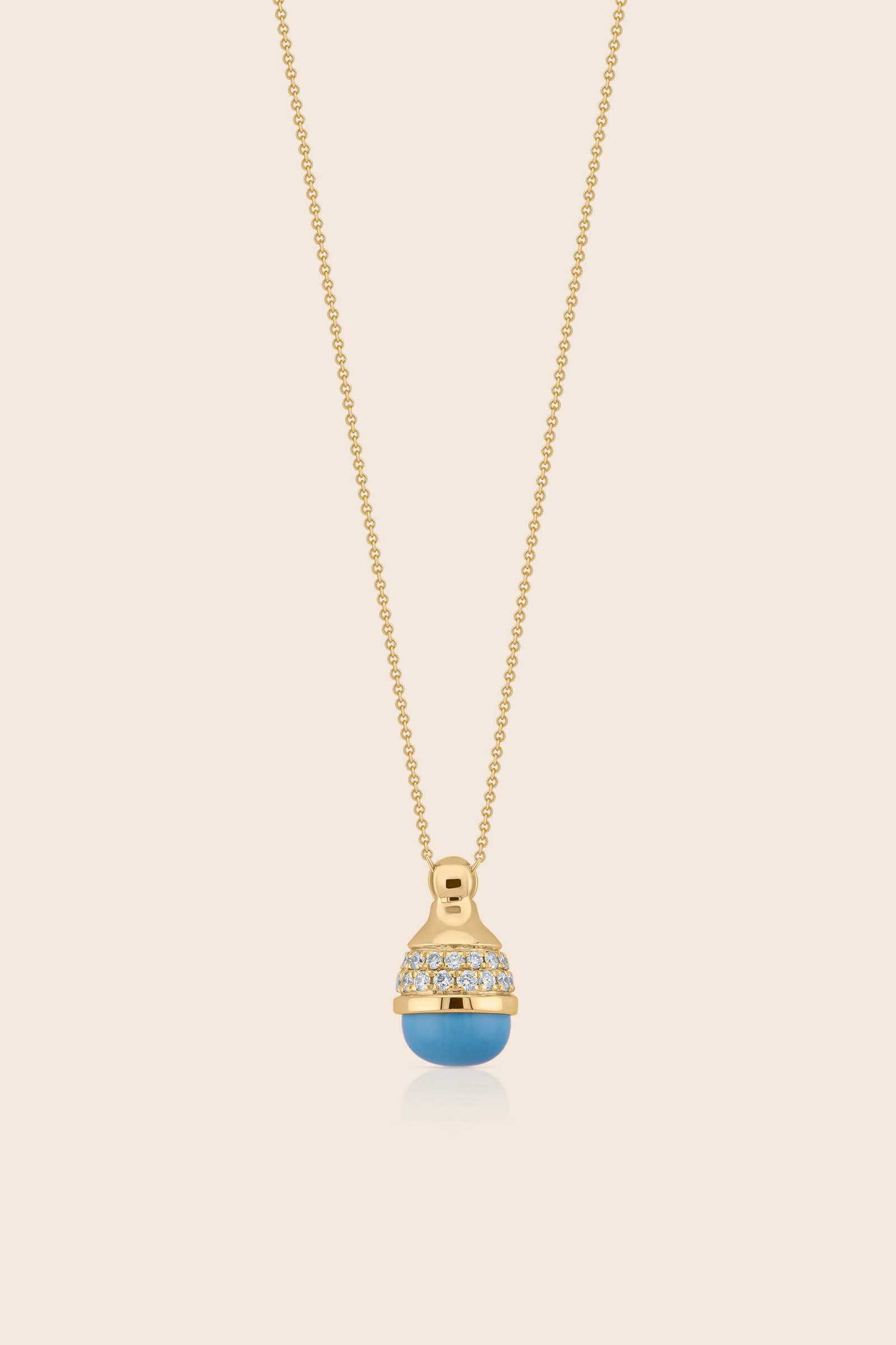Turquoise drops shimmer beneath a sparkling diamond frame in yellow gold radiating energy, harmony, and the timeless beauty of sunlit elegance.