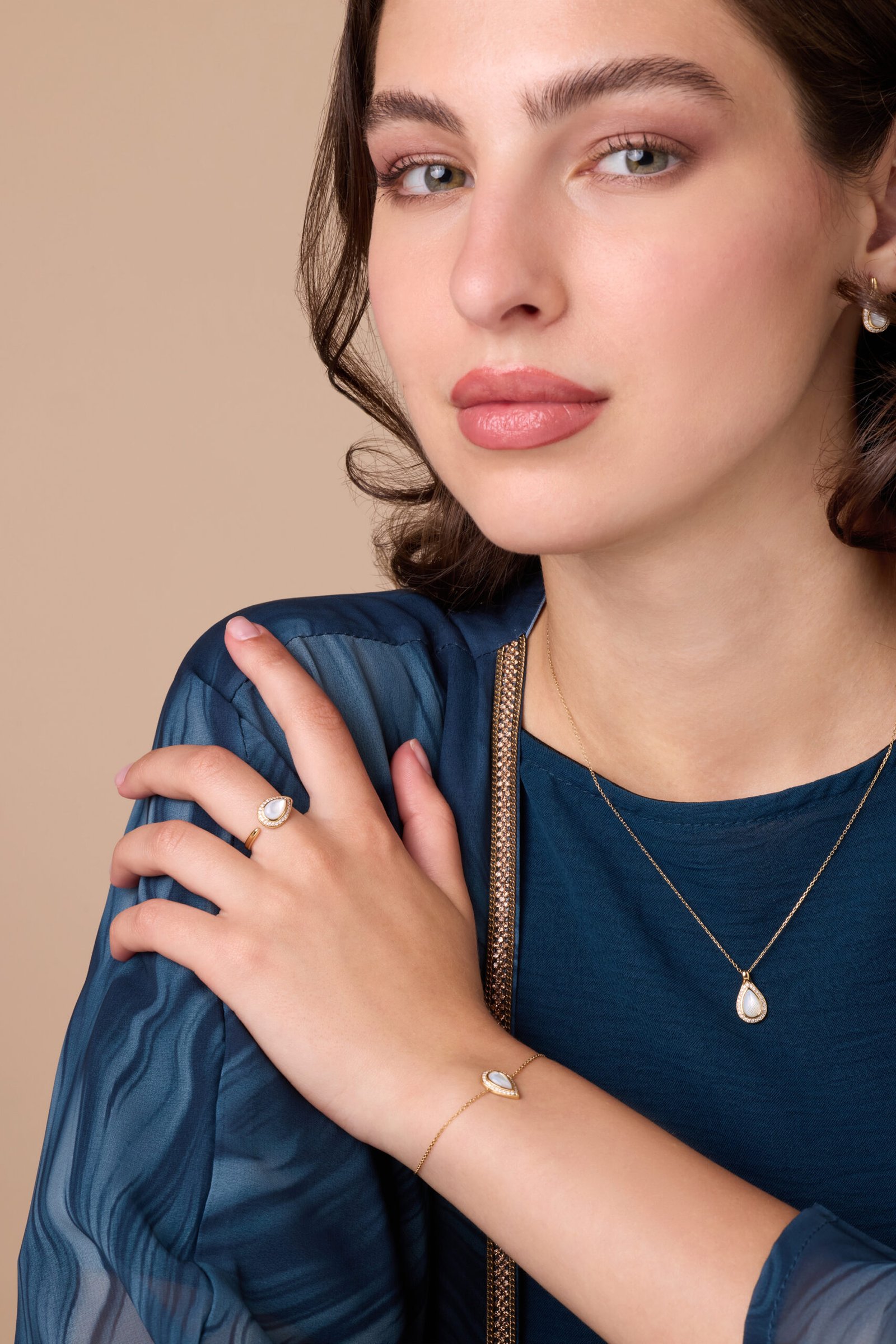 Delicate mother of pearl drops complement sparkling diamonds set in yellow gold evoking soft elegance, natural beauty, and timeless feminine grace.
