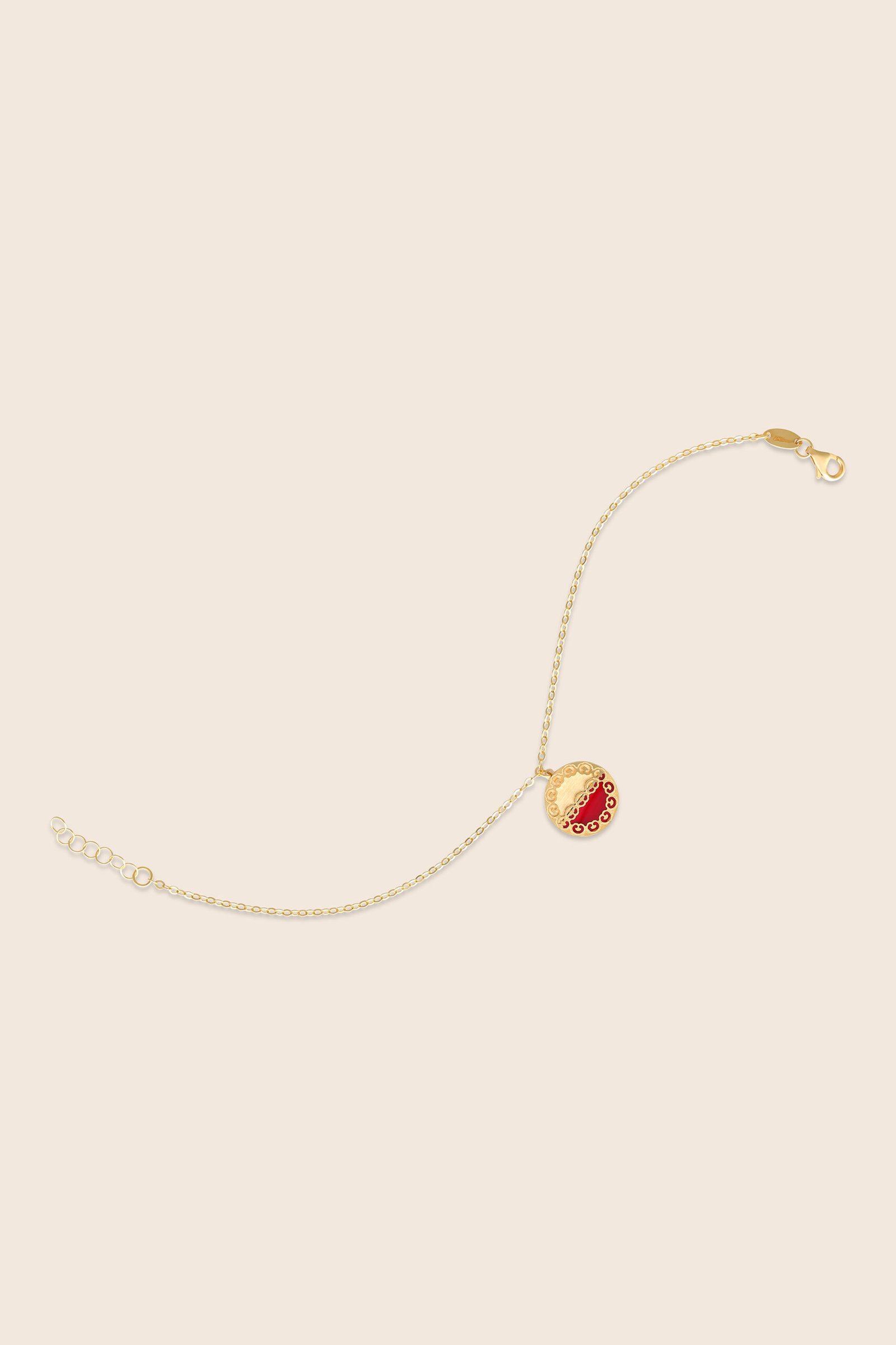 Embraced by a band of yellow gold, vivid dangling ruby and luminous enamel are set with delicate detailing, where elegance meets artistry and strength