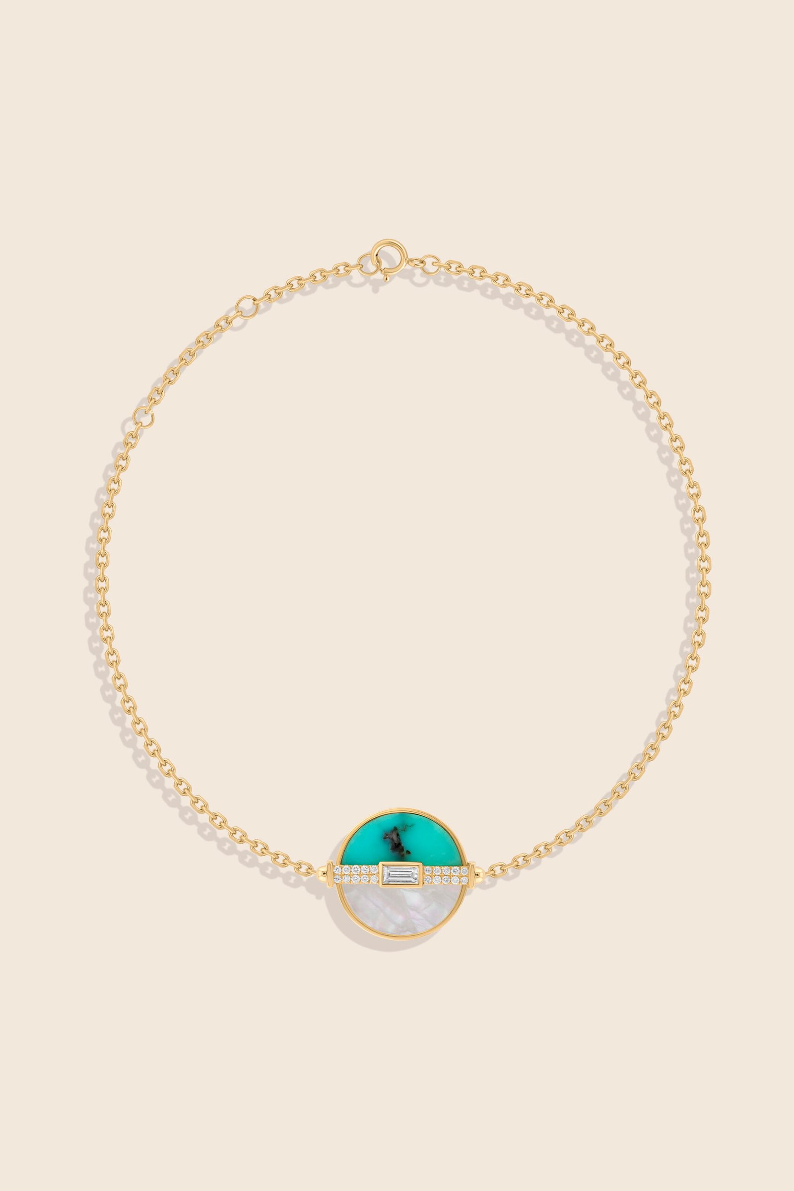 Turquoise and mother of pearl shine beside diamonds in yellow gold capturing serenity, light, and the joyful harmony of nature?s contrasting beauty.