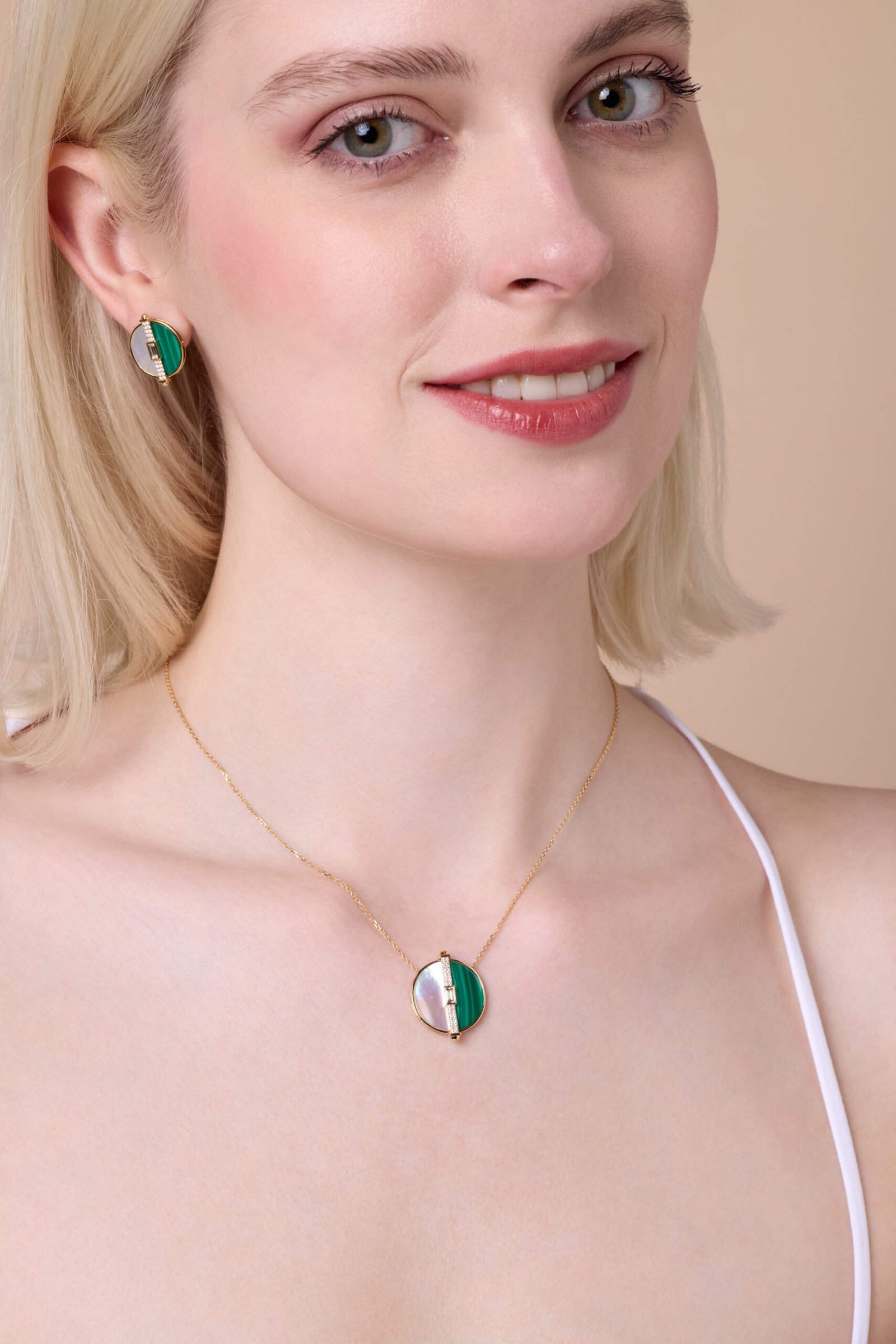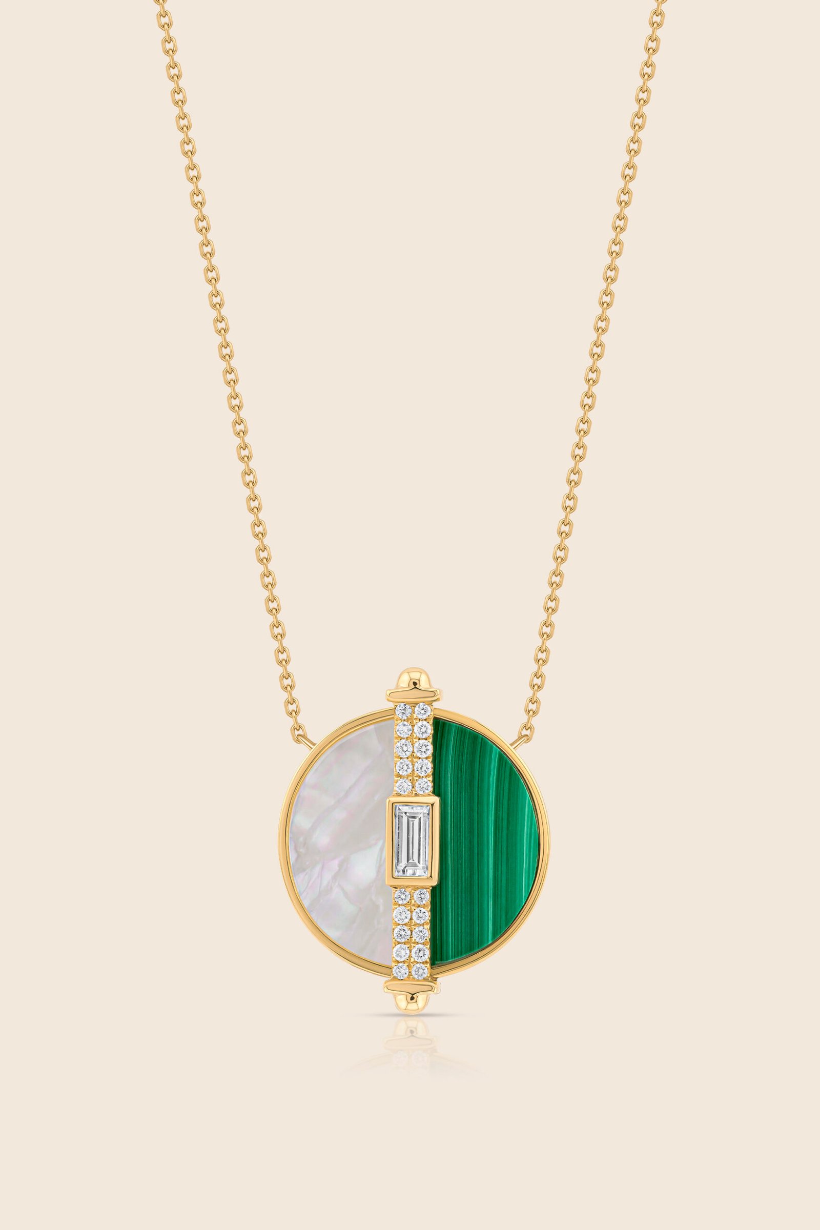 Mother of pearl and malachite unite in yellow gold with diamond accents reflecting harmony, renewal, and the graceful beauty of earth and light.
